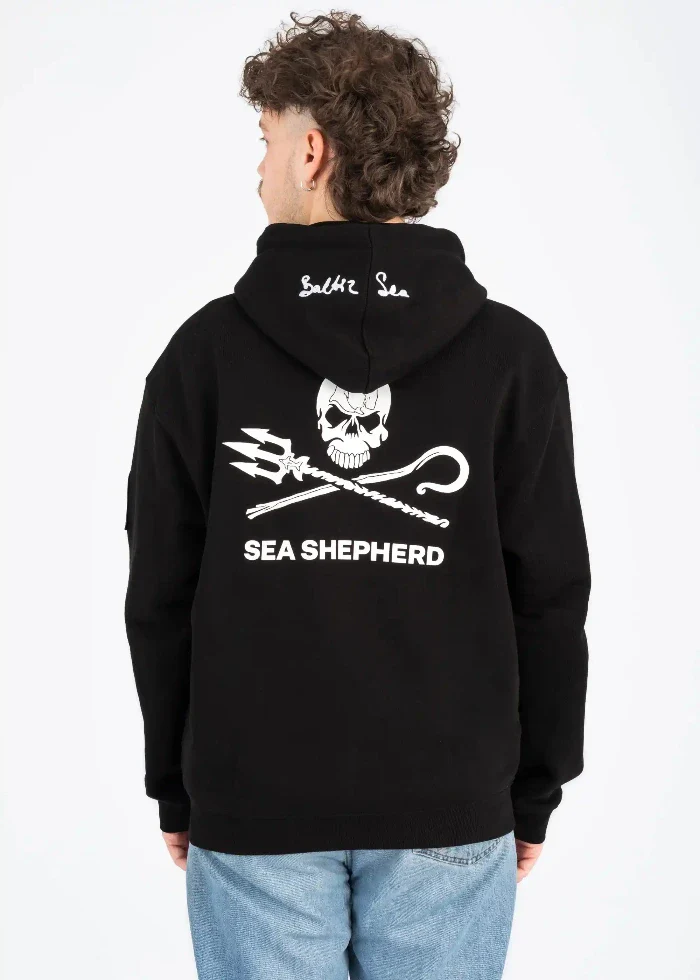 Hand in Hand für den Meeresschutz. Gemeinsam mit dem FC St. Pauli ist eine kleine Kollektion entstanden, die zwei leidenschaftliche Partner miteinander verbindet. Das Artwork zur Kollektion stammt von Designer Lars Gödeke aus Hamburg und wurde zusammen mit St. Pauli und Sea Shepherd entwickelt. Der Patch zeigt die beiden ikonischen Totenkopf-Logos unterhalb der TRITON, dem Schiff von Sea Shepherd Deutschland, welches nur gut 75 km vom Millerntor-Stadion entfernt in Travemünde vor Anker liegt.